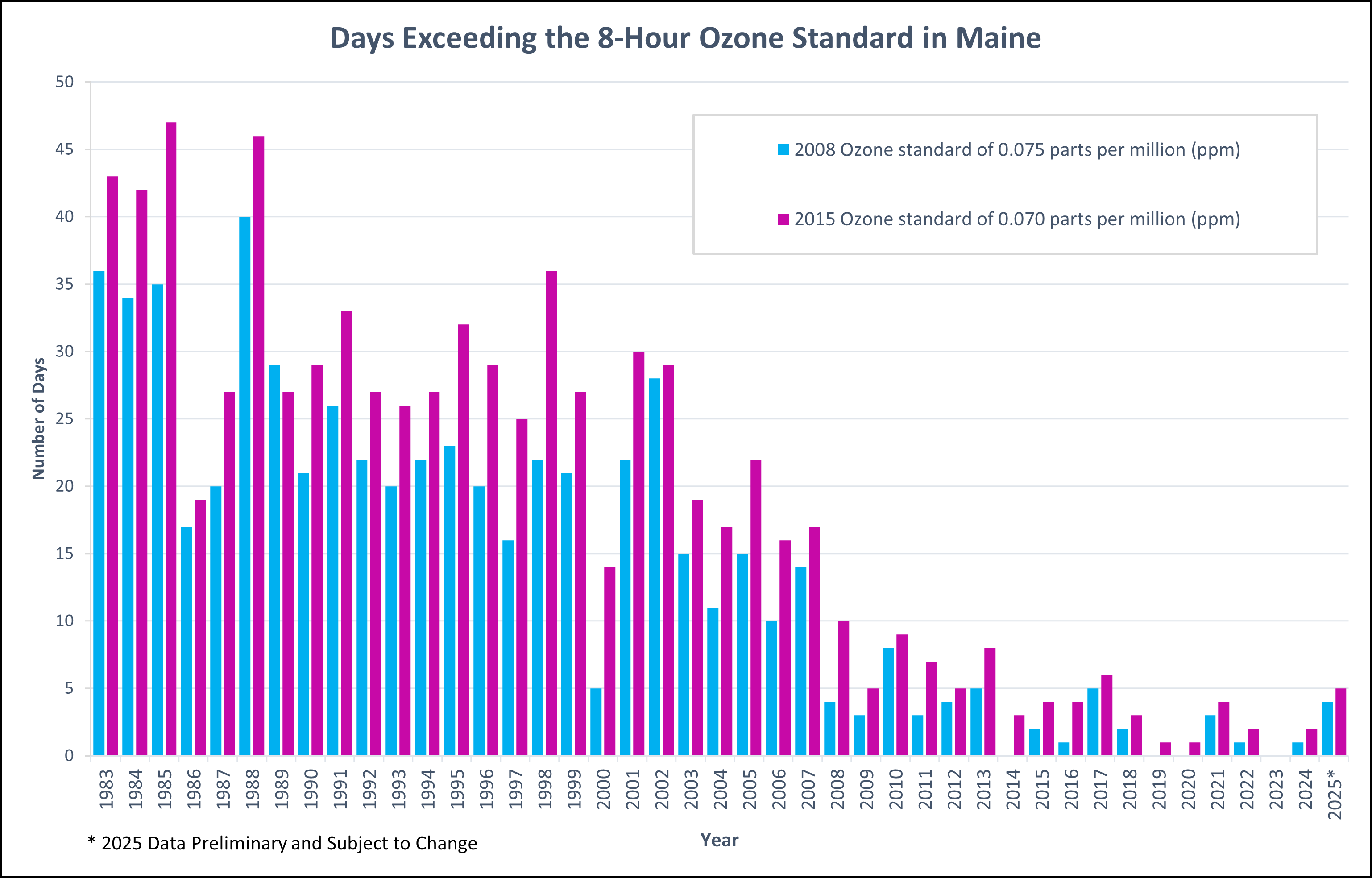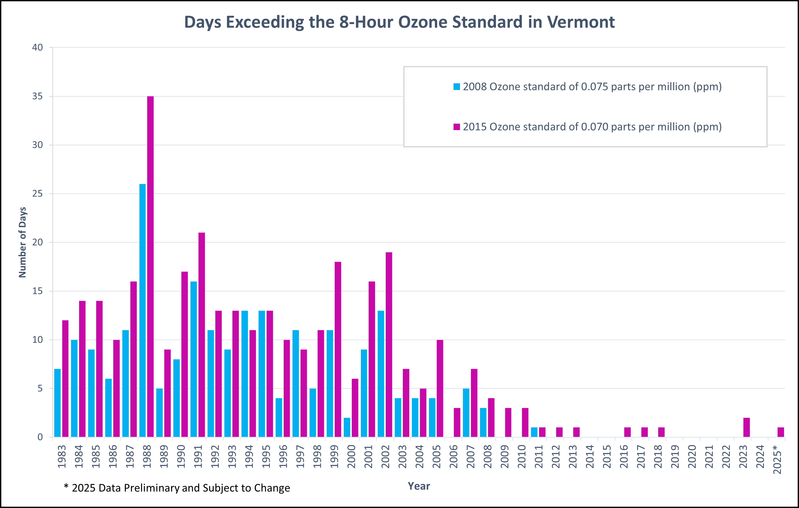 The chart below shows the number of days air quality monitors in each New England state recorded ozone concentrations exceeding the 2008 8-hour ozone standard (that is, days greater than 0.075 parts per million (ppm)), as well as the number of days exceeding the 2015 8-hour ozone standard (that is, days greater than 0.070 ppm).