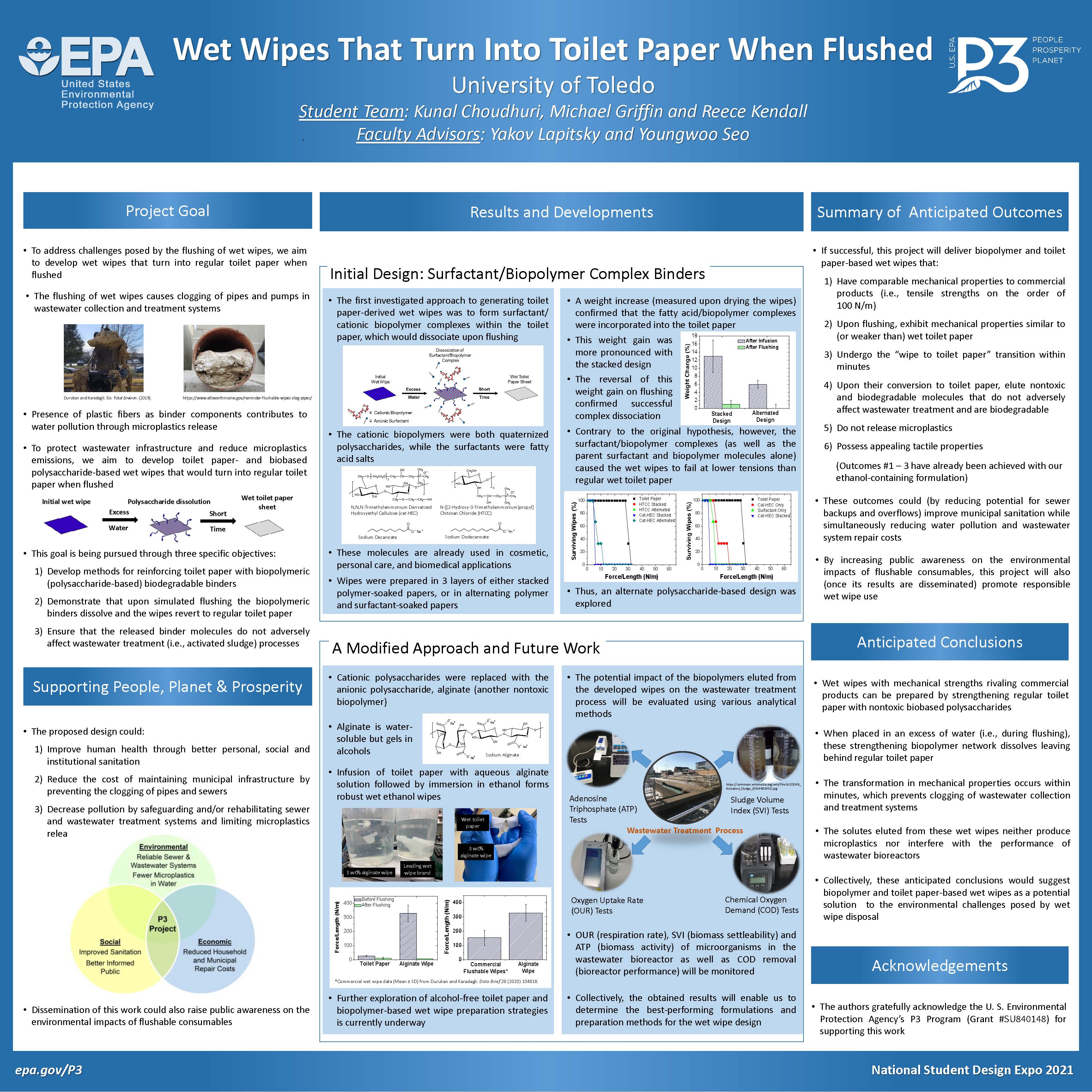 The flushing of wet wipes (even those marketed as flushable) causes clogging in wastewater collection and treatment systems. To this end, our EPA P3 project aims to develop wet wipes that turn into regular toilet paper when flushed. In the video below, we summarize our progress to date, provide a brief demonstration of our best-performing design, and discuss our plans for further research and development.