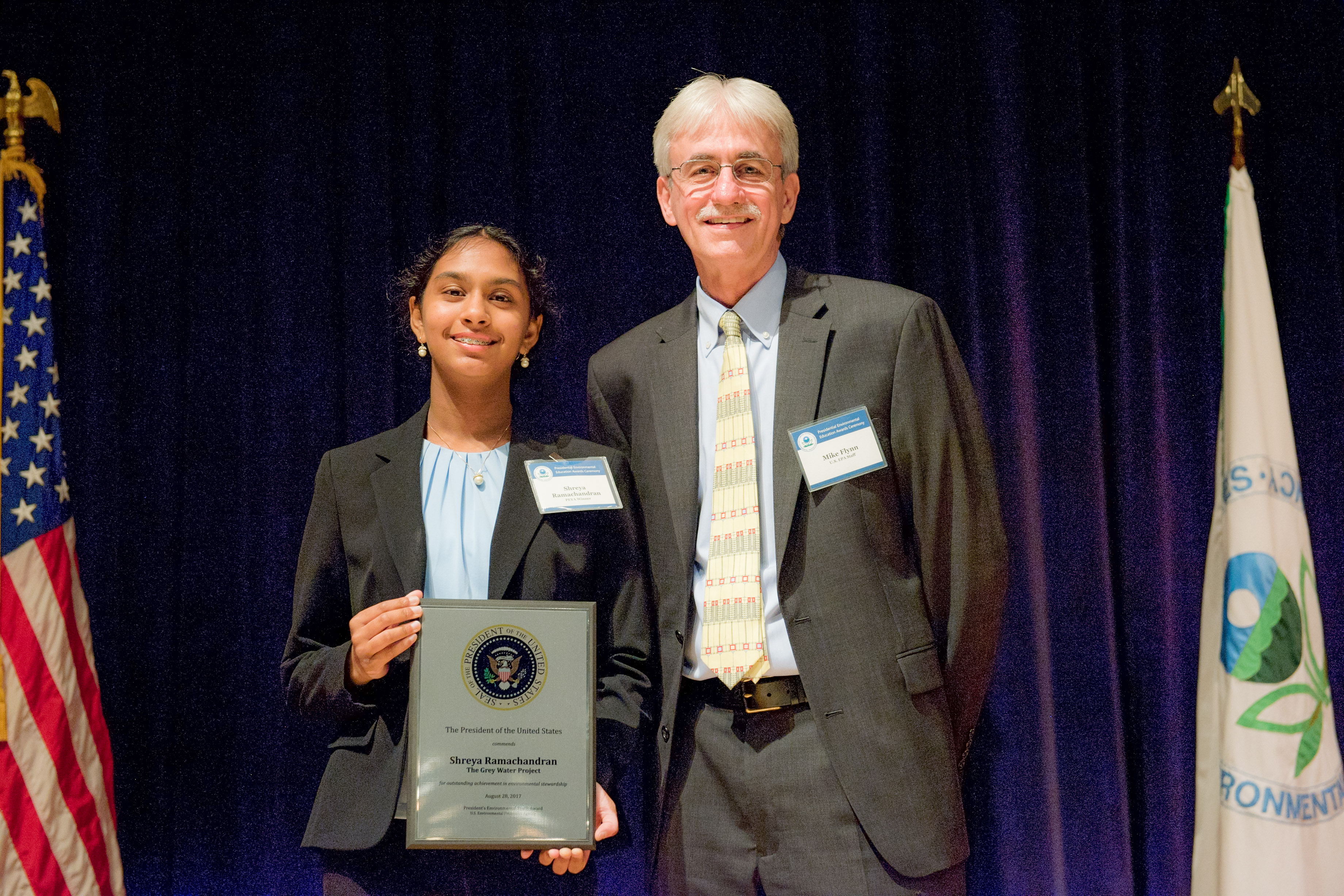 Thirteen-year-old Shreya Ramachandran won the award for her study of grey water use in water conservation. Having seen firsthand the effects of drought in California and in India, Shreya began researching ways to conserve and reuse water. Shreya found that many commercial laundry detergents include chemicals that can be detrimental to soil, plants and aquatic life. To address this, she conducted tests to see if grey water from soap nuts—a natural laundry detergent derived from the Indian soap berry—could be used as irrigation water without harming the environment. She conducted multiple tests, comparing grass that had been exposed to regular water, soap-nut grey water, organic and non-organic detergent grey water. She found that soap nut grey water was beneficial to plant growth and cost less than an organic detergent.