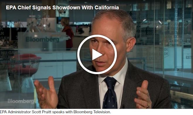 In a wide-ranging interview with Bloomberg, EPA Administrator Scott Pruitt said "California is not the arbiter of these issues" when discussing national fuel standards. "The Trump administration's chief environmental regulator signaled a coming showdown with California, warning the state won't dictate the future of ambitious automobile fuel economy regulations enacted by the Obama administration. 'California is not the arbiter of these issues,' said Environmental Protection Agency Administrator Scott Pruitt. California regulates greenhouse gas emissions at the state level, 'but that shouldn't and can't dictate to the rest of the country what these levels are going to be.'"
