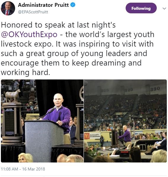 From discussing cleaning-up Superfunds and streamlining permitting processes for America's job creators, to speaking at the Oklahoma Youth Expo and visiting EPA's Region 6 headquarters, EPA Administrator Scott Pruitt continued to advance President Trump's environmental agenda.