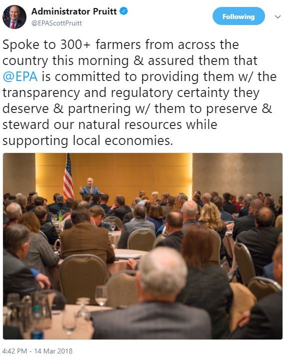 The Arkansas Democrat Gazette reported on a meeting between EPA and the Arkansas Farm Bureau (AFB) which was heralded as"one of the best meetings I've had in D.C." by AFB President Randy Veach. "Afterward, the Arkansans were summoned to meet with the head of the Environmental Protection Agency. ‘They found out that we were in D.C., and EPA Administrator Scott Pruitt had his people to call us and ask if we could meet with him,' Veach said. ‘I'll be honest with you: I've been coming to D.C. for a long [time] and this is probably one of the best meetings I've had in D.C.'"
