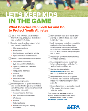 Youth sports coaches and athletic administrators are in a unique position to help ensure the health and safety of young athletes. EPA has created a presentation and companion checklist to help coaches and athletic administrators better understand the environmental health risks associated with youth sports and the steps they can follow to protect young athletes.