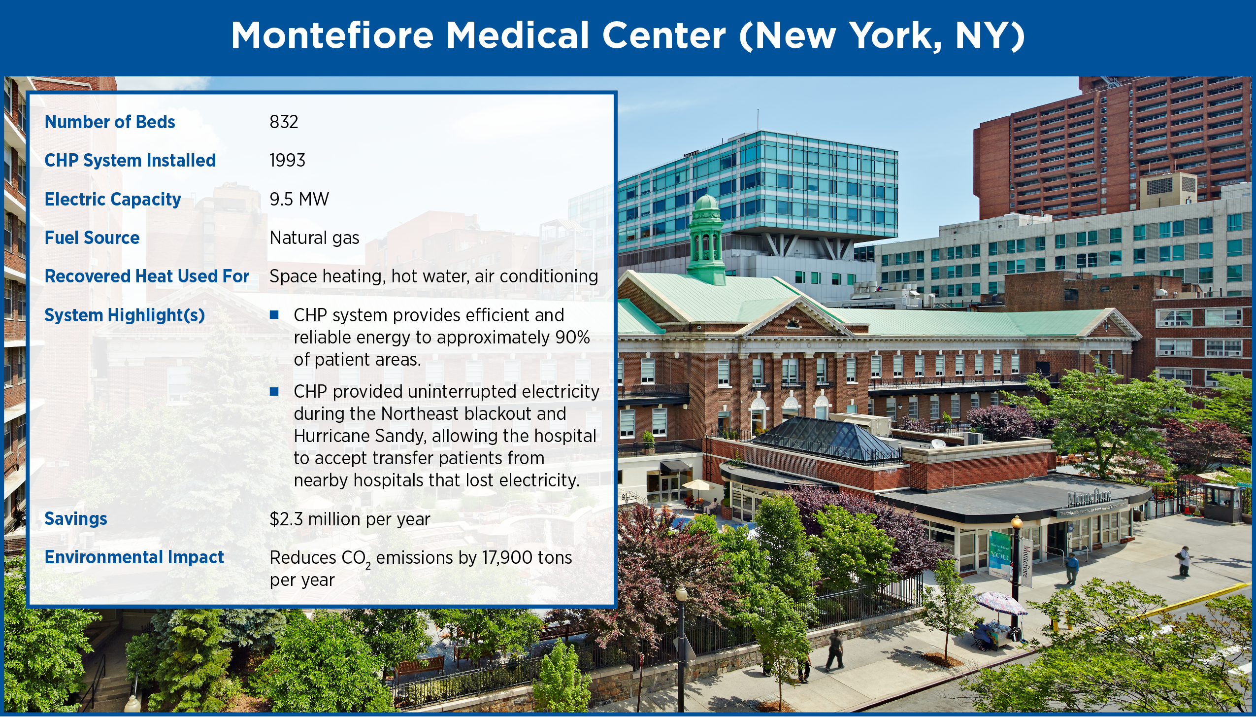MMC notes that its investment in CHP “allows us to provide to Montefiore patients, employees and members of the communities we serve a safe, reliable, resilient and environmentally-friendly source of power.” Furthermore, the hospital estimates that its CHP system saves over $2 million annually in energy costs.