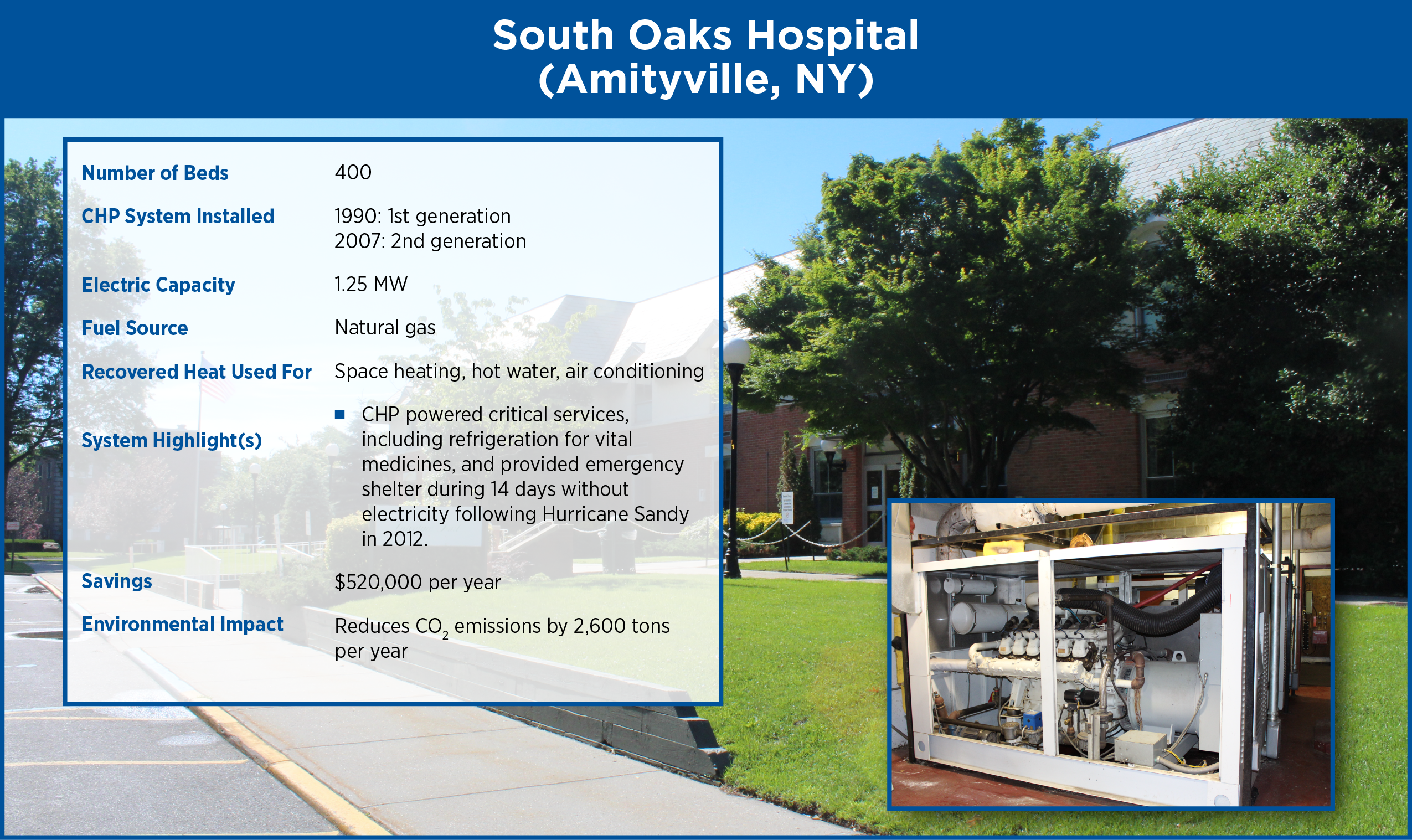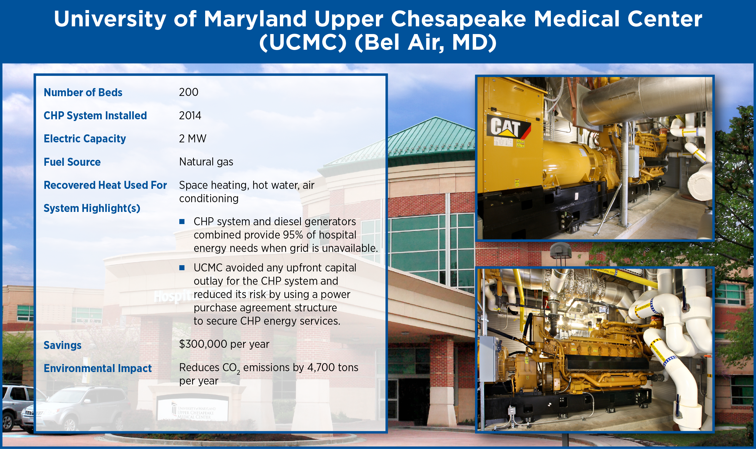 CHP does not supplant the need for hospitals to install and maintain emergency generators to support life-critical services (as required by local, state, and federal codes and standards). However, adding CHP can be a better choice than relying solely on emergency generators.