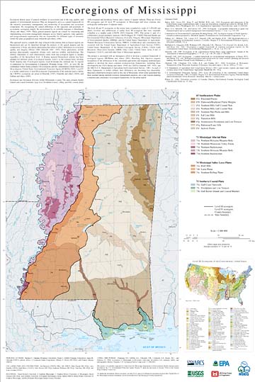 The level III and IV ecoregions on this poster were compiled at a scale of 1:250,000 and depict revisions and subdivisions of earlier level III ecoregions that were originally compiled at a smaller scale (USEPA 2003; Omernik 1987). This poster is part of a collaborative project primarily between USEPA Region IV, USEPA National Health and Environmental Effects Research Laboratory (Corvallis, Oregon), Mississippi Department of Environmental Quality (MDEQ), and the United States Department of Agriculture-Natural Resources Conservation Service (NRCS). Collaboration and consultation also occurred with the United States Department of Agriculture-Forest Service (USFS), United States Department of the Interior-Geological Survey (USGS), USGS Earth Resources Observation Systems (EROS) Data Center, United States Army Corps of Engineers (USACE), and with other State of Mississippi agencies.