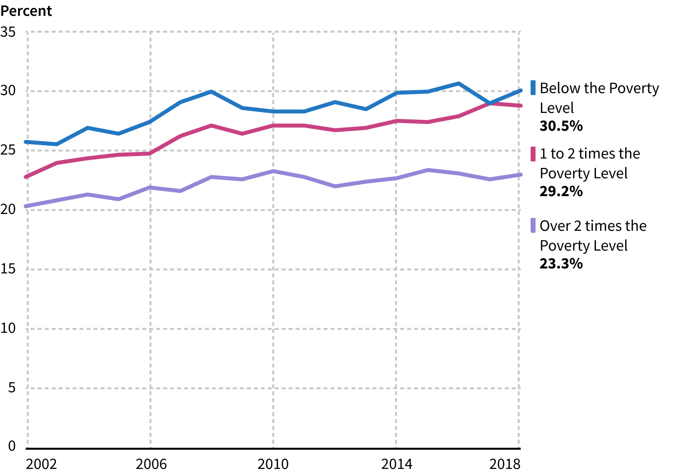 These charts show the age-adjusted rates of hypertension in adults in the U.S. from 2002 to 2018, broken down by race/ethnicity and socio-economic status. In 2018, across race/ethnicity, people identifying as Non-Hispanic Black or African American have the highest rates of hypertension, at 32.8%, compared to an overall average of 24.8%. Since 2002, adults in households below the poverty level have consistently had the highest rates of hypertension (30.5% in 2018), followed by adults in households between 1 and 2 times the poverty level (29.2% in 2018), followed by adults in households over 2 times the poverty level (23.3% in 2018).
