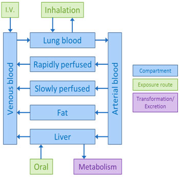 In comparison to these simple models, a physiologically based PK (PBPK) model is a complex, multi-compartment model. It accounts for an organism’s physiology and the chemical properties of the contaminant.