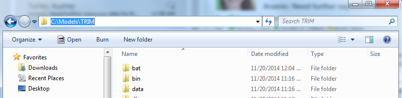 - Enter the install directory for TRIM.FaTE. This is the location you entered in Step 2.1.c (above). The default directory is C:\Models\TRIM. If you installed TRIM.FaTE to another location, open Windows Explorer and find the TRIM directory and navigate to the TRIM folder. In the navigation bar at the top of the explorer window, click to the right of the folder paths. This will provide you with the directory you can copy and paste into the installation text box (see image below).