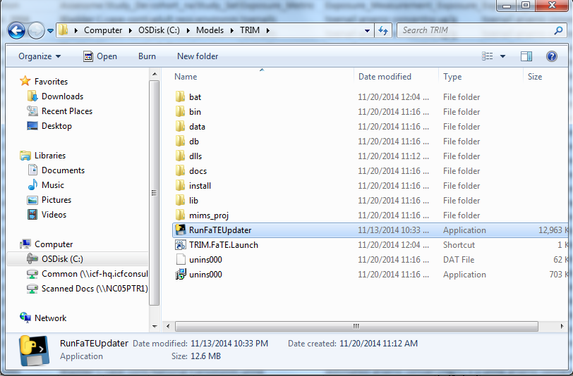 In order to update TRIM.FaTE, or if you chose not to configure TRIM.FaTE on install, you will need to open Windows Explorer and navigate to the TRIM folder and double-click on the RunFaTEUpdater to update TRIM.FaTE (see image below). This will require you to re-enter the directory and MySQL information from step 4 (Setup).