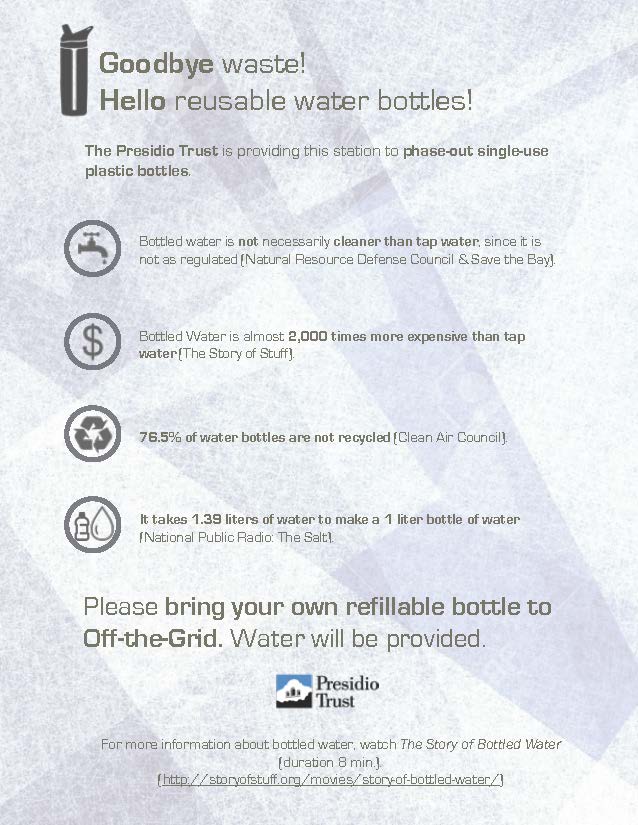 - In 2016, the Presidio Trust banned the sale of water bottles at these events. Signage, which highlighted the reasons for the ban, were posted. Large, refillable water containers were provided to attendees. Reusable water bottles were given away at the first picnic with the water bottle ban, and paper cups were provided thereafter. In addition, the Trust adopted standards ensuring that the vendors used recyclable and compostable serviceware for their foods and beverages.