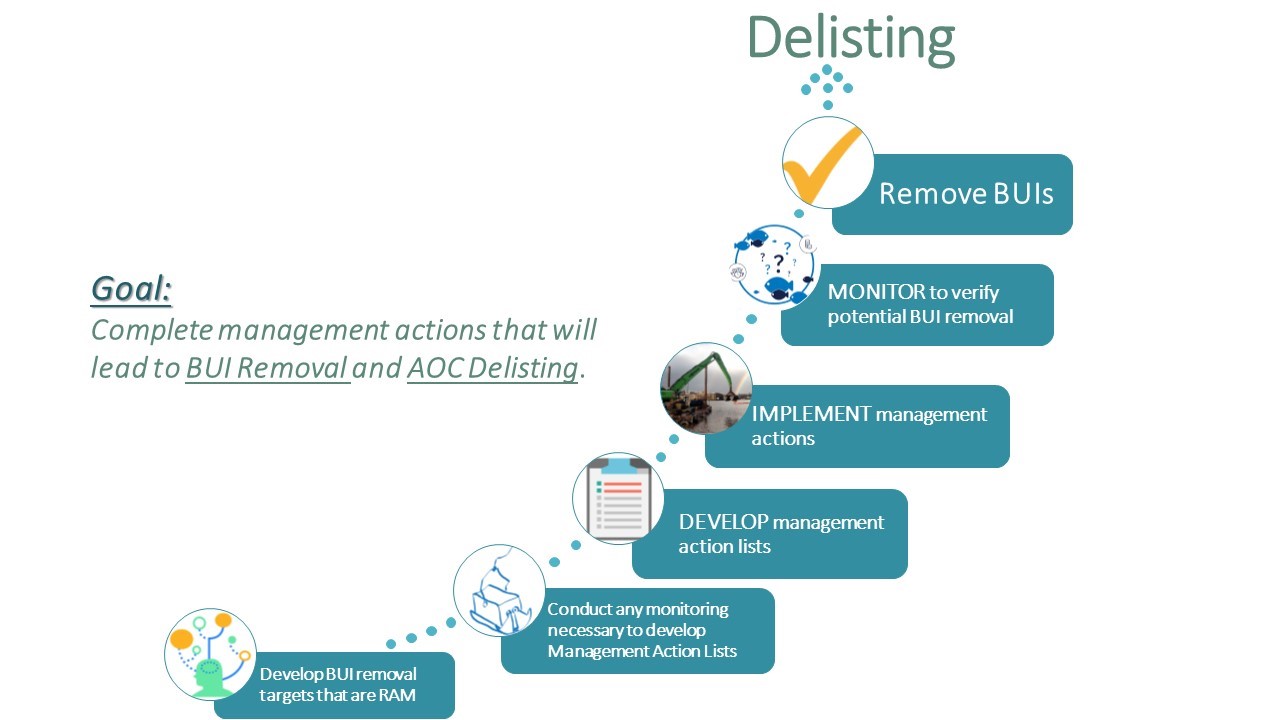 Once all the management actions necessary for removing all BUIs have been completed, the AOC may move into the “Management Actions Complete” phase. These actions may not result in the immediate removal of a set of BUIs, but they are expected to allow environmental conditions to improve over time and lead to eventual BUI removal and AOC delisting.
