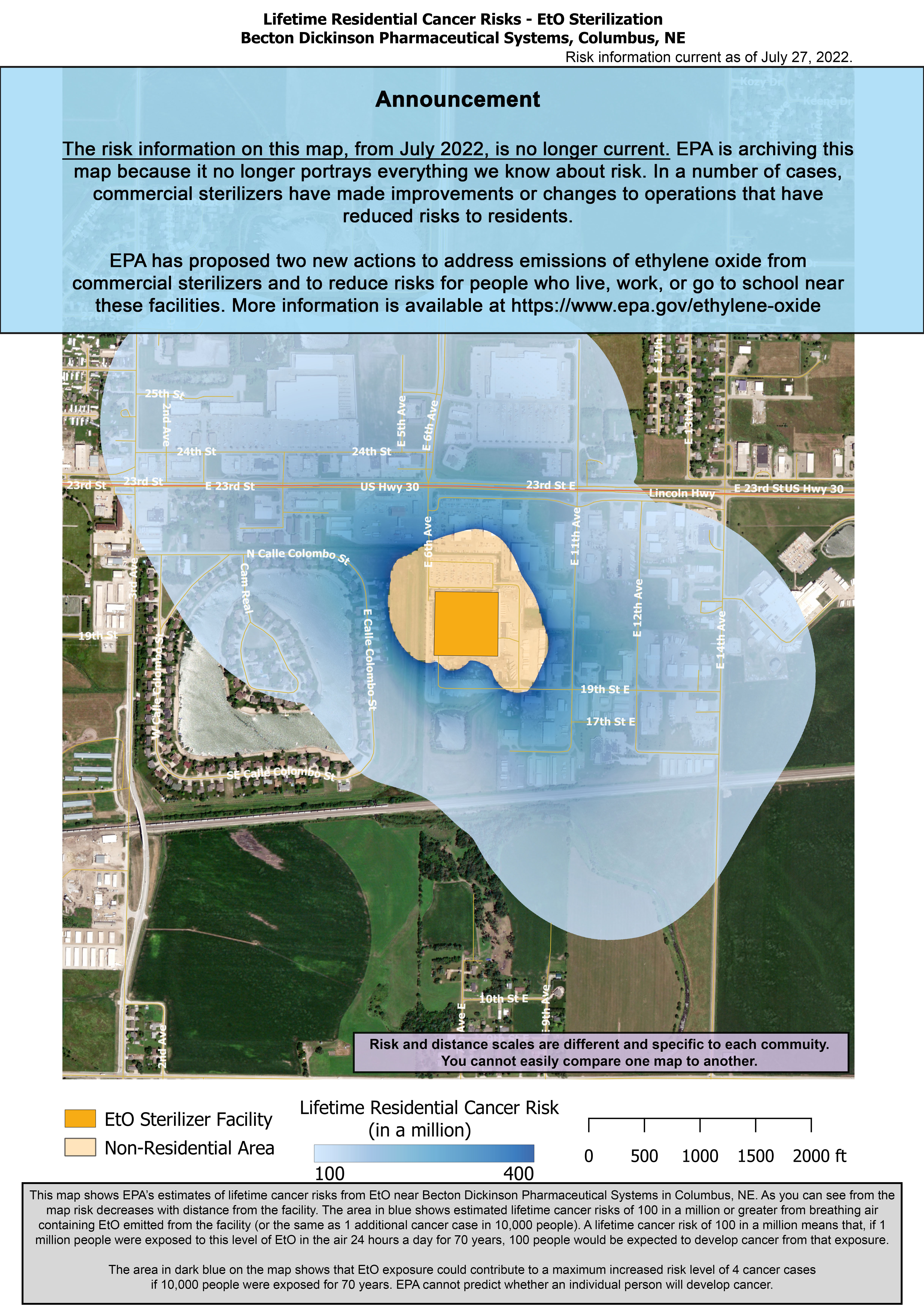 This map shows EPA’s estimates of lifetime cancer risks from EtO near Becton Dickinson Pharmaceutical Systems in Columbus, NE. As you can see from the map risk decreases with distance from the facility.