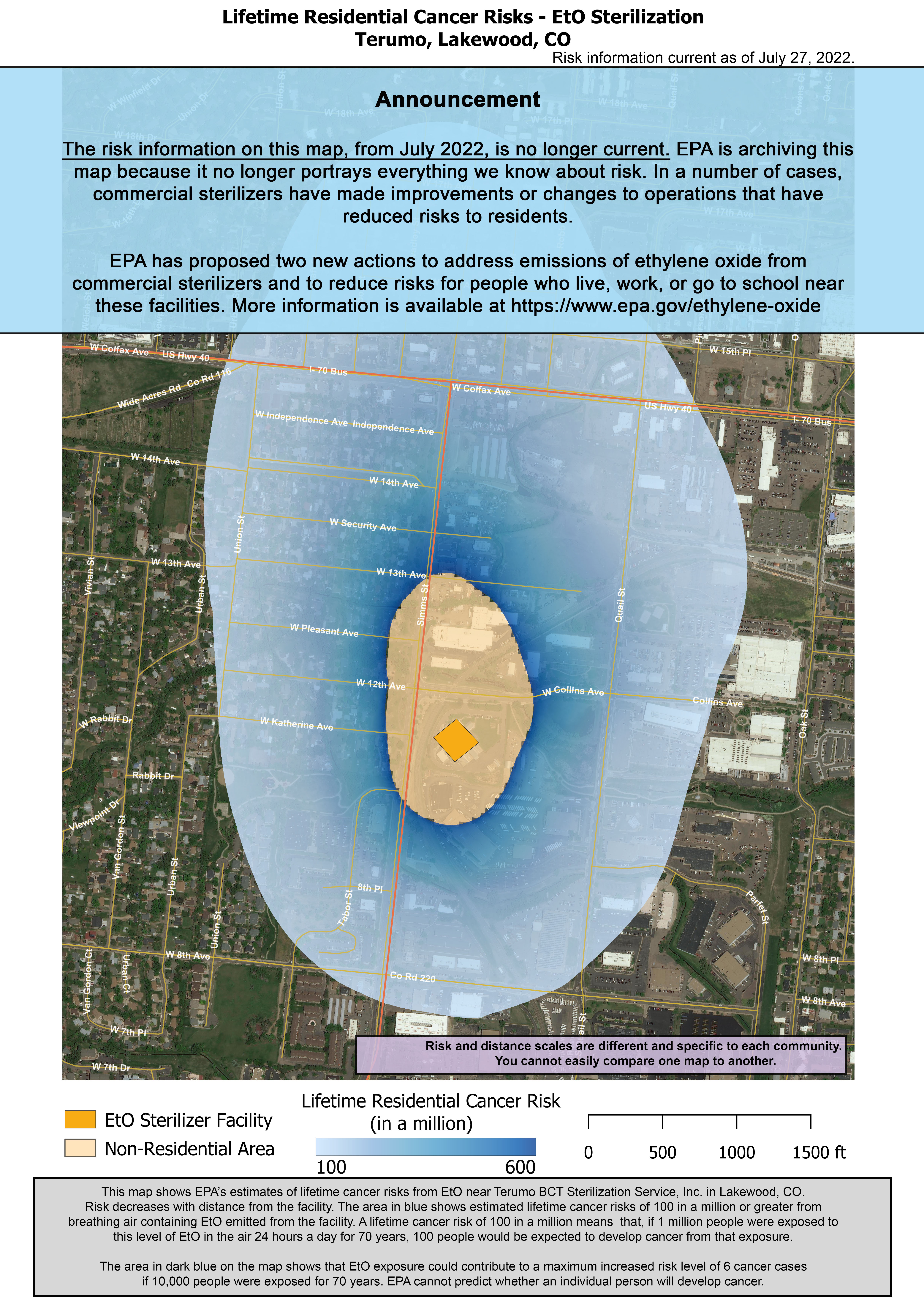 This map shows EPA’s estimates of lifetime cancer risks from EtO near Terumo BCT Sterilization Service, Inc. in Lakewood, CO. As you can see from the map risk decreases with distance from the facility.
