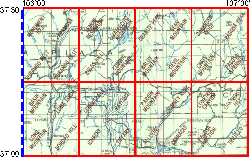 Click on any of the eight 15 by 15 minute quadrangles (outlined in red) to download binary base map files for that area. Alternatively, you can choose from a text list of available 15 by 15 minute quadrangles.