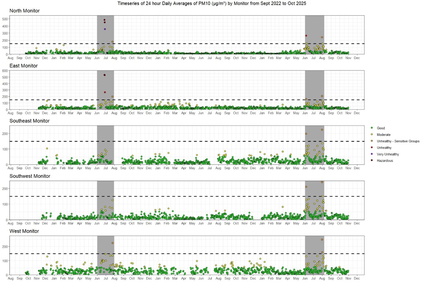 Timeseries of 24-hour Daily Averages of PM10 (µg/m3) by Monitor from September 2022 to October 2025. [Click to view a larger version of this image.]