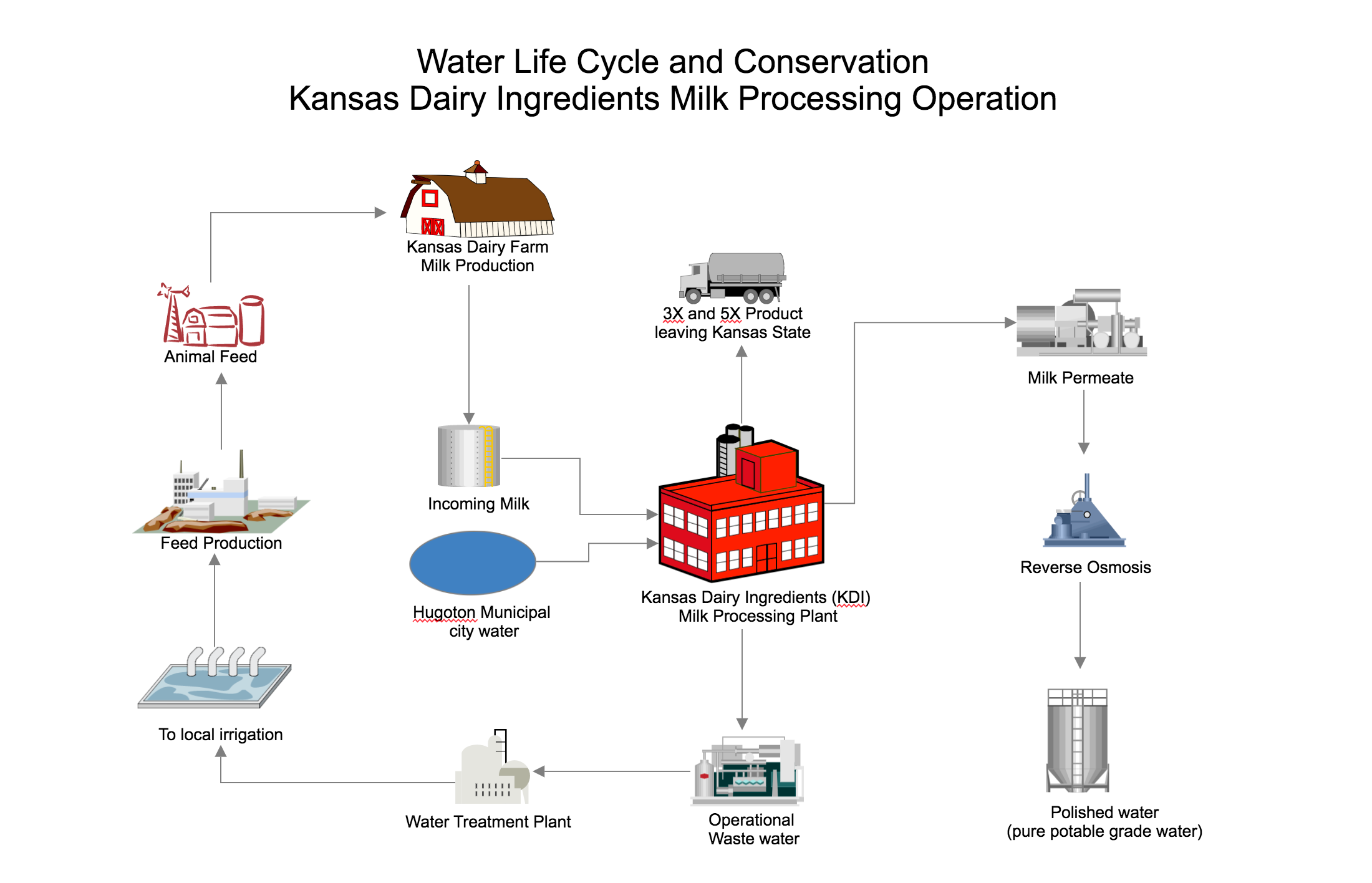 Kansas Dairy Ingredients is a model for other facilities by exemplifying consolidation for bulk transportation and water reuse strategies. Facilities that use bulk transportation of raw materials and finished products can reduce volumes and weight of shipments by concentrating the volume before reaching the processing facility or market. They can also identify means to reduce the weight and volume of the raw material shipment, which helps prevent pollution at many levels.