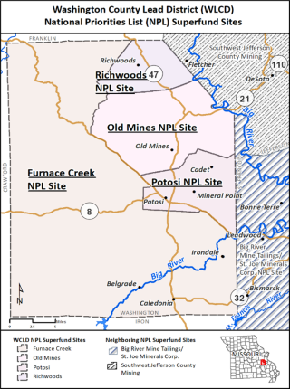 The U.S. Environmental Protection Agency (EPA) Region 7 is remediating (cleaning up) lead-contaminated soil at residential properties within the Washington County Lead District (WCLD) National Priorities List (NPL) Superfund Sites. Lead mine waste was dispersed throughout the area from historic mining activities in the Old Lead Belt in southeastern Missouri. Four NPL sites cover Washington County: Furnace Creek, Old Mines, Potosi, and Richwoods (see two WCLD maps at right below).