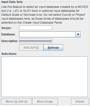 This section also includes controls to reorder the database selections. The order of the databases is relevant if you select multiple databases that have inputs for the same table. If the same record (i.e. a record having the same values of all primary key fields but generally different non-key field values) is present in more than one input database, the record from the user input database listed last is the one used in MOVES.