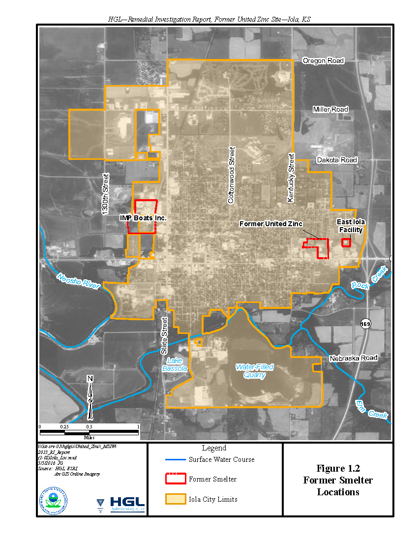 Iola was the home of several zinc and lead smelting plants during the early 1900s. The United Zinc and East Iola smelters were located on the east side of town. The Lanyon smelters were located on the west edge of town. While these smelting plants were demolished long ago, lead contamination associated with these smelters was distributed throughout the city of Iola and remains an environmental and health hazard.