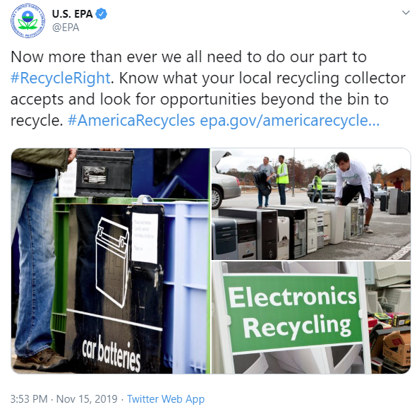 "The EPA under President Donald Trump has made significant strides in boosting recycling... EPA in 2020 will support workshops across the country to build markets for recycled materials, kick off a pilot education campaign to increase public awareness of how to recycle, establish a set of national definitions, and create a national map of existing recycling infrastructure to identify gaps..." (Bloomberg Environment, 11/15/19)