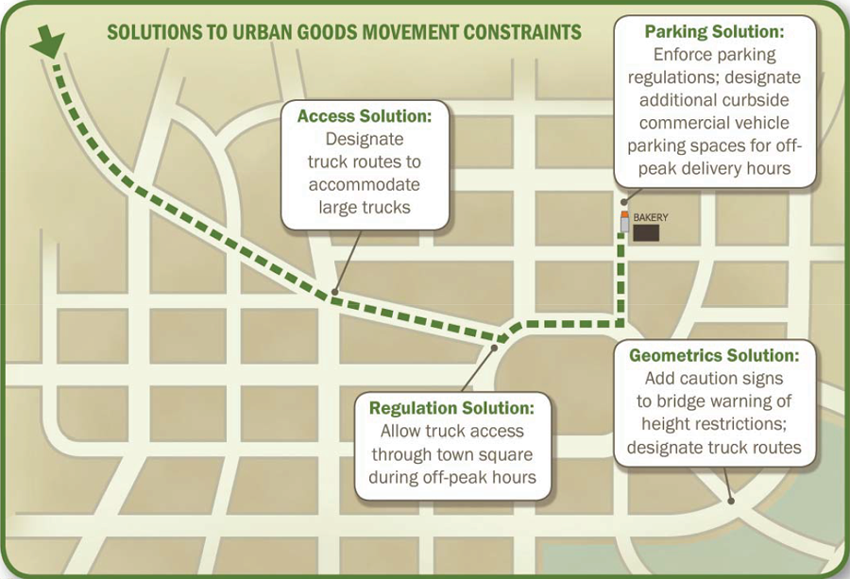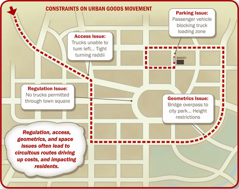 • Land use and zoning (e.g. location of freight facilities, parking and loading zones, delivery windows/time of day restrictions)