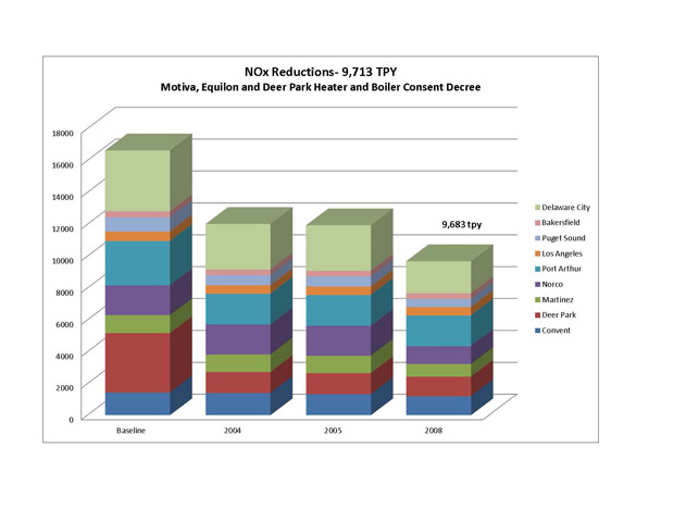 The Heaters and Boilers consent decree required a reduction in NOx emissions from refinery heaters and boilers, from a pre-settlement baseline level of 16,633 tons per year (tpy) down to 9713 tpy – a reduction of 6,920 tpy. Actual emission reductions achieved from implementation of the consent decree resulted in a slightly better level than originally required, down to 9683 tpy, or a cumulative reduction of 6950 tpy.