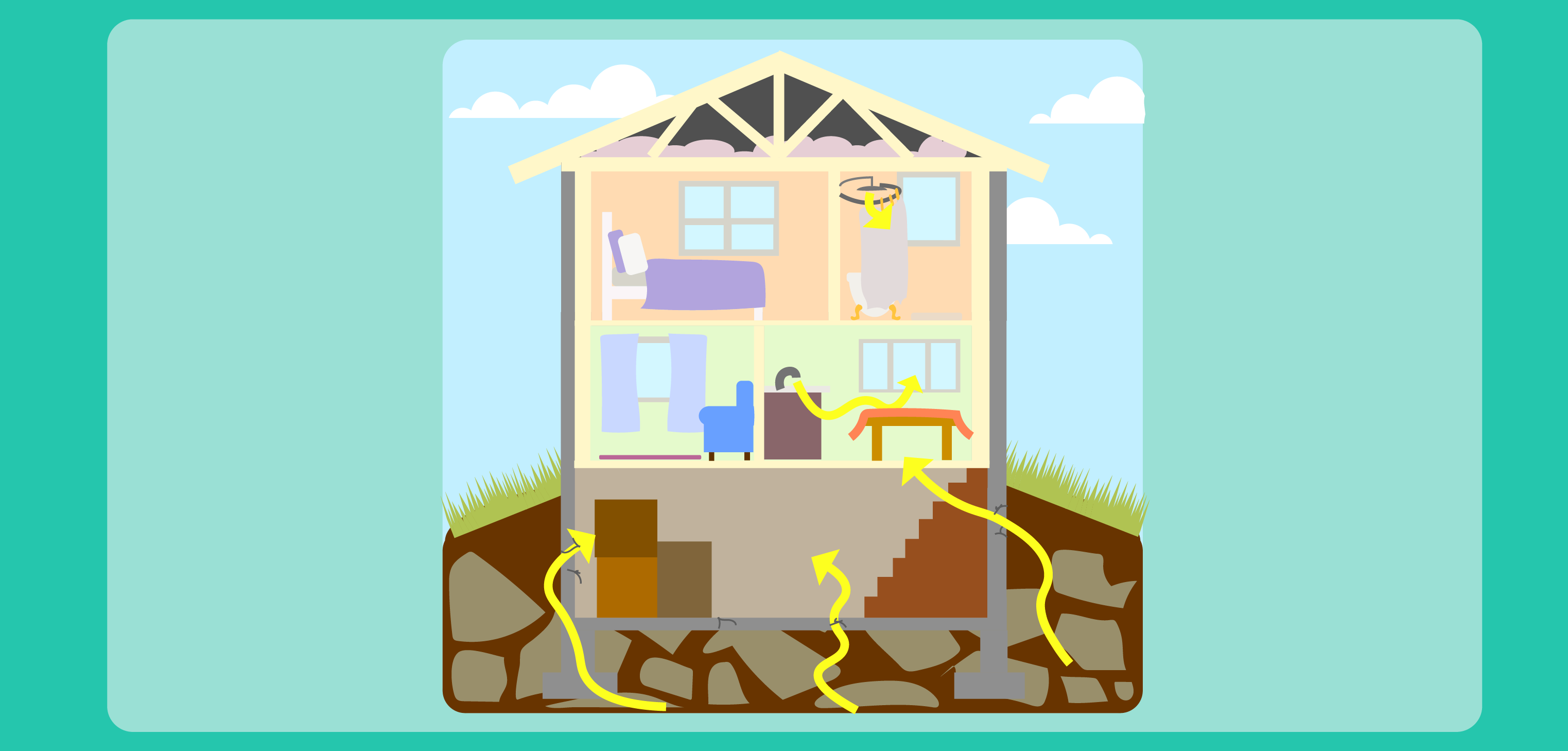 - Ask students to hypothesize why certain areas (or the area where they live) have greater potential for higher indoor radon levels or why two houses side by side can have very different radon levels. This is due to the geology below the individual homes. It may be that the rock and soil has a higher uranium content (and because of radioactive decay, higher radon content), or that the type of rock and soil and presence of cracks and fissures that might allow radon to move up more easily through the ground. How well the homes are built, including how well floors, walls and gaps are sealed or how ventilated the home is, may be other factors.
