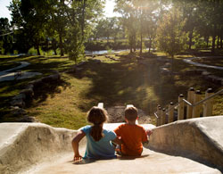 This multi-facility park built on a flood plain connects to downtown and adjacent low-income housing, brings economic benefits, and has become the recreational heart of the city.