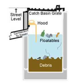 Catch basin hoods are installed within a catch basin in front of the outlet pipe, with the hood bolted to the manhole. Hoods form a baffle against floatable litter, preventing large floatables like aluminum cans and bottles from getting into the sewers or stormwater pipes. Hoods are not full-capture devices, and therefore, must be used in-series with other trash capture methods to ensure full capture. Catch basin hoods should be equipped with anti-siphon devices, and coupled with deep-sump catch basins, in order to maximize the capture of both floatable and settleable trash.
