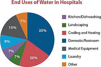 Approximately seven percent of the total water use in commercial and institutional facilities in the U.S. takes place in hospitals and other health care facilities. The largest uses of water in hospitals are cooling equipment, plumbing fixtures, landscaping, and medical equipment.