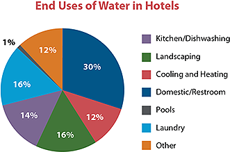 Approximately 15 percent of the total water use in commercial and institutional facilities in the U.S. takes place in hotels and other lodging businesses. The largest uses of water in hotels are restrooms, laundry operations, landscaping, and kitchens.